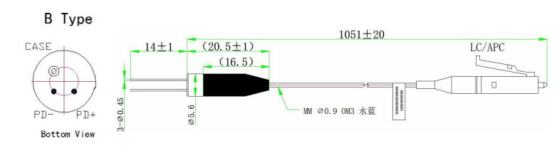 InGaAs Pigtailed fotodiodai, sujungti daugiamodiais pluoštais, kurių šerdies skersmuo yra 50 µm arba 62,5 µm, o aptikimo bangos ilgis yra 900–1700 nm.