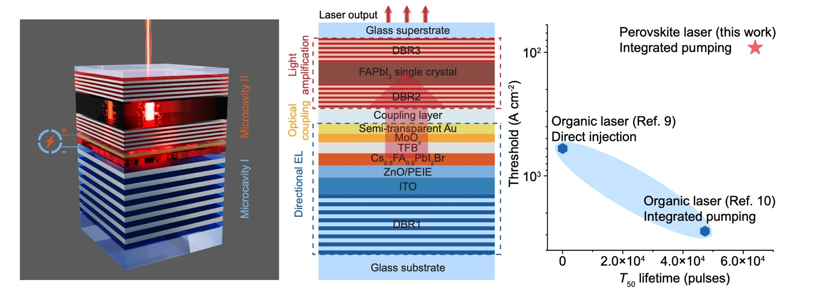 Puslaidininkiniai lazeriaiyra svarbūs šviesos šaltiniai kompiuterijoje. Perovskitiniai puslaidininkiai yra nauja lazerinių medžiagų klasė, pasižyminti mažomis eksploatacinėmis sąnaudomis ir lengvai integruojama į silicio pagrindu sukurtas optoelektronines platformas. Jų derinami emisijos spektrai leidžia optiškai varomiems lazeriams pasiekti žemiausią įmanomą lazerio slenkstį, atveriant reikšmingas technologines galimybes. Išorinė energija, reikalinga lazeriams valdyti, paprastai tiekiama dviem būdais: elektros energija ir optine energija. Tačiau optiniam valdymui paprastai reikalingi aukštos kokybės išoriniai šviesos šaltiniai, o tai riboja veikiančių įrenginių skaičių. Elektra varomų perovskito lazerių kūrimas yra pagrindinis perovskito optoelektronikos iššūkis.