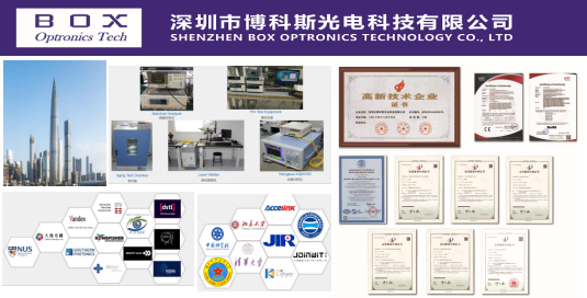 Shenzhen Box Optronics Technology Co., Ltd.(BOX Optronics Tech) yra aukštųjų technologijų įmonė, kurios specializacija yra šviesolaidinis ryšys ir šviesolaidinis jutiklis. Bendrovė yra įsipareigojusi teikti klientams aukštesnės kokybės produktus ir paslaugas, greitesnį atsakymo į paslaugas laiką ir padėti klientams sukurti didesnę vertę. Turėdama stiprius MTEP, gamybos ir pardavimo pajėgumus, taip pat patyrusius produktų kūrimo inžinierius, įmonė gali pritaikyti individualius produktus pagal skirtingus klientų poreikius. Jau daugelį metų įmonė yra įsipareigojusi technologinėms naujovėms, nuolat diegdama pažangias technologijas ir talentus. Ji gavo AAA lygio kredito įmonės, technologijomis pagrįstos MVĮ ir nacionalinės aukštųjų technologijų įmonės sertifikatus ir sėkmingai išlaikė ISO9001 kokybės sistemos sertifikatą, griežtai laikydamasi sistemos reikalavimų ir griežtai tikrindama produktų kokybę.