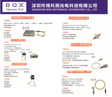 SOA puslaidininkiniai optiniai stiprintuvai: pasirenkami bangos ilgiai 1060, 1270, 1310, 1550, 1560 nm, išėjimo galia 10 dBm-25 dBm, didelis stiprinimas, mažas triukšmo rodiklis, tinkamas medicininiams UŠT, biomedicininiams vaizdams, konvertuojančioms šviesolaidinėms jungtims ir optinėms perjungimo bangų kompensavimo jungtims.